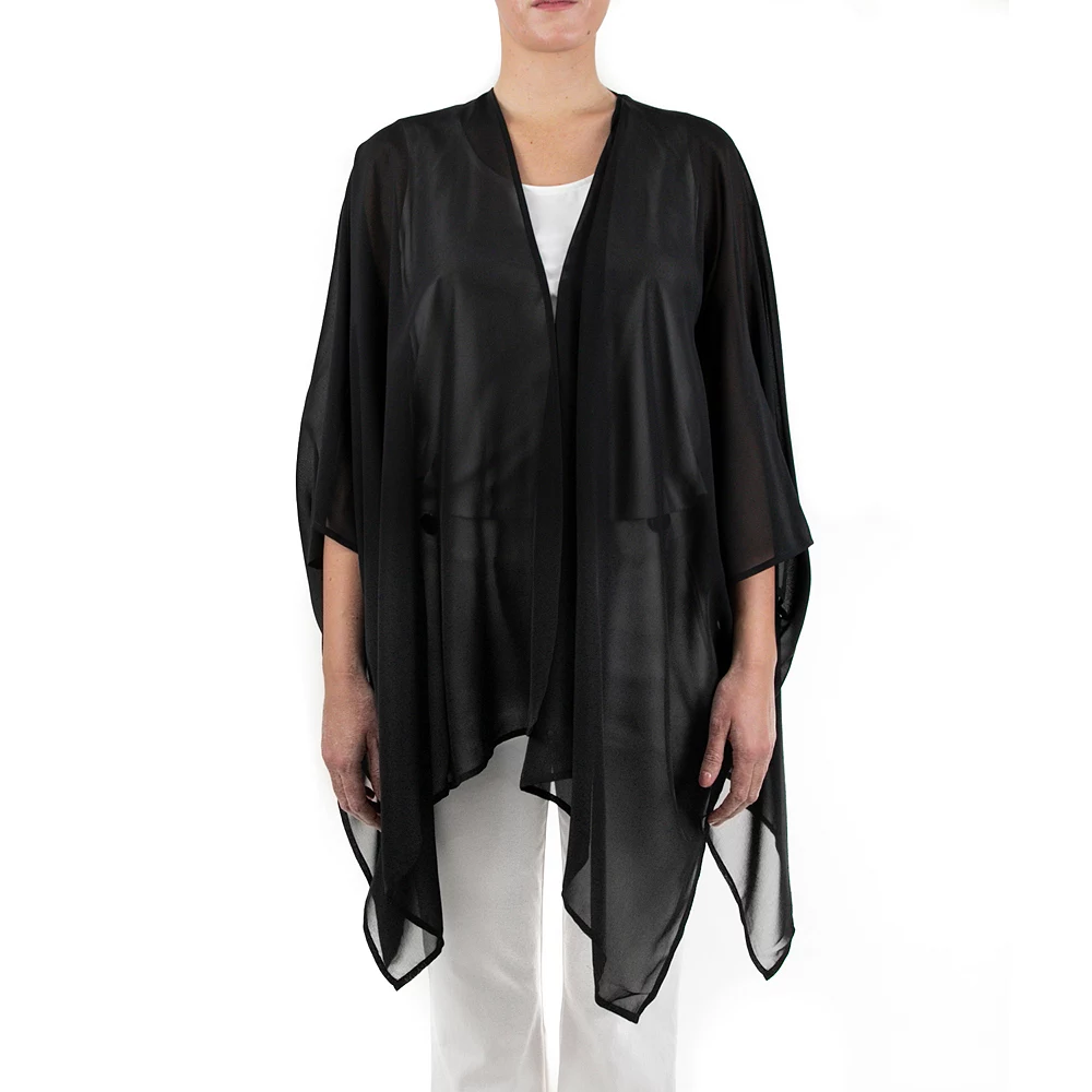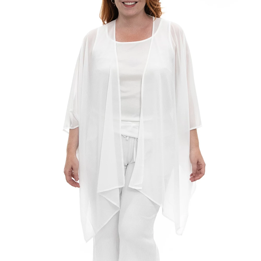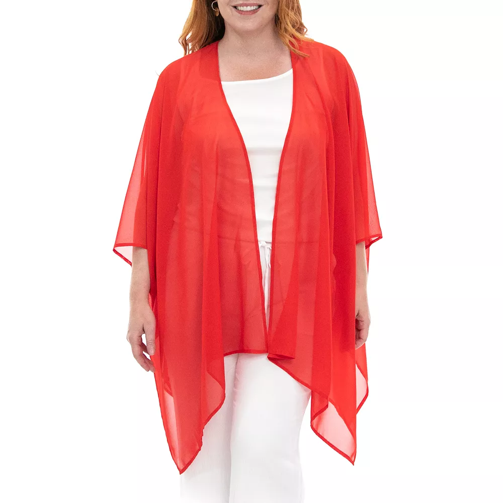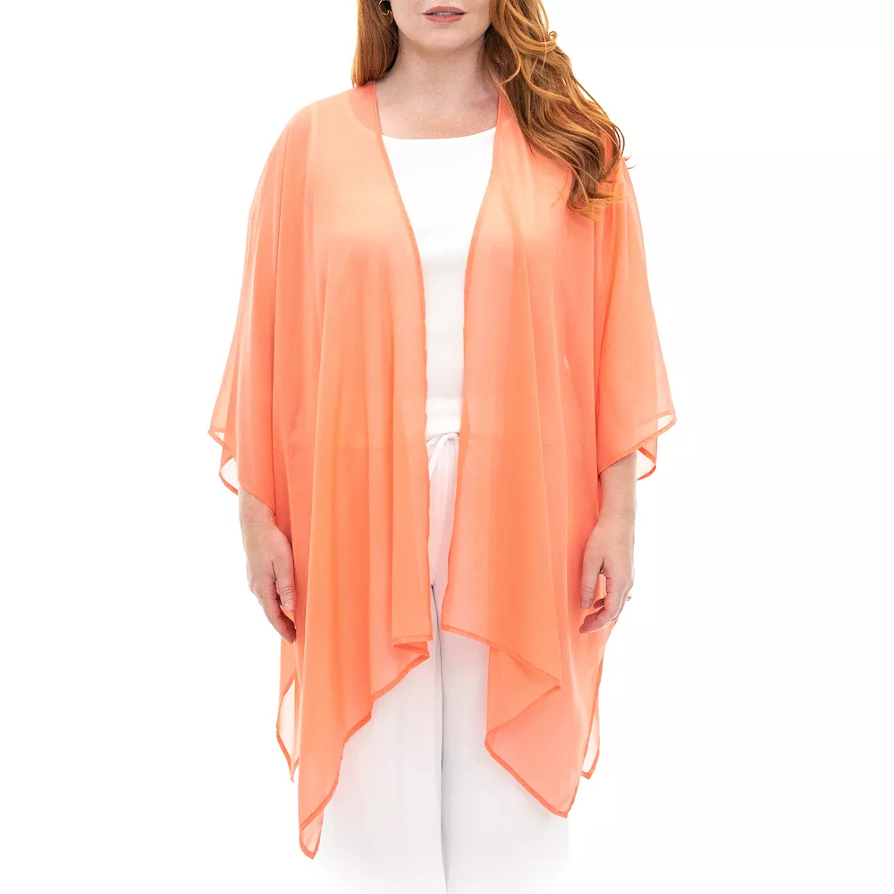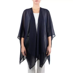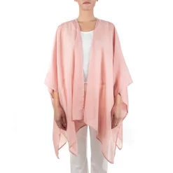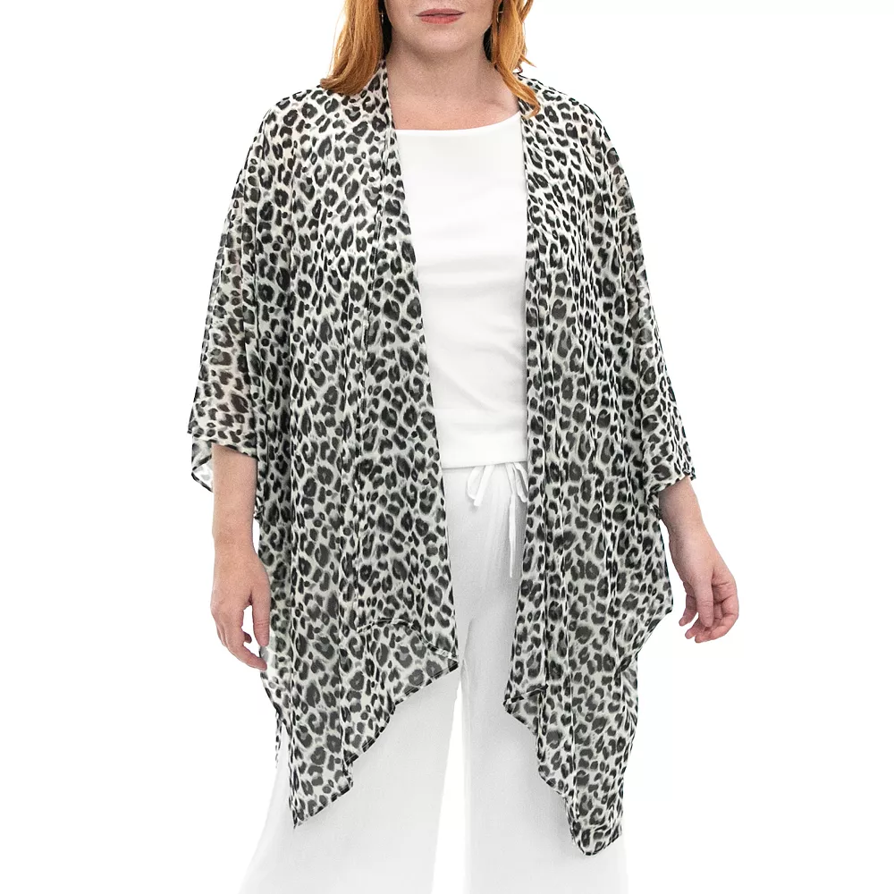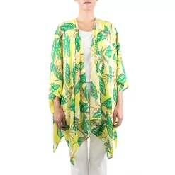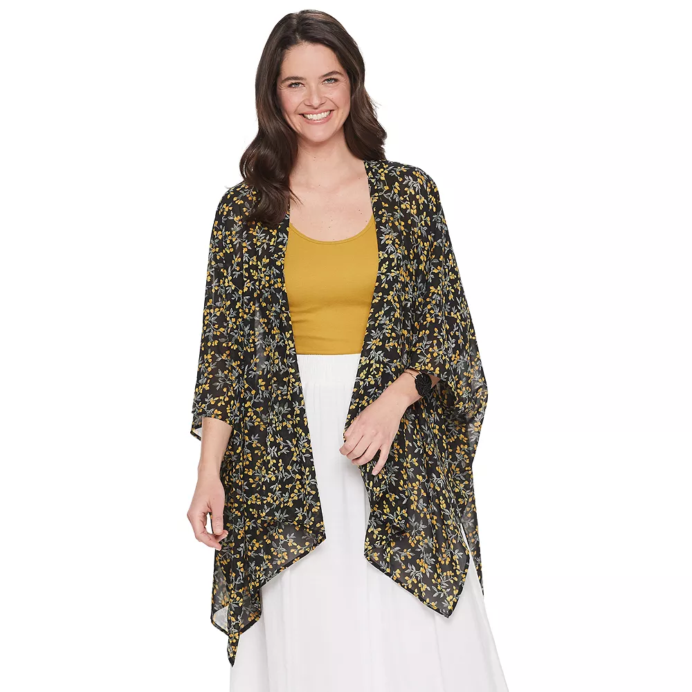 A draped design and a floral print make this women’s Nina Leonard kimono an excellent layering piece.
