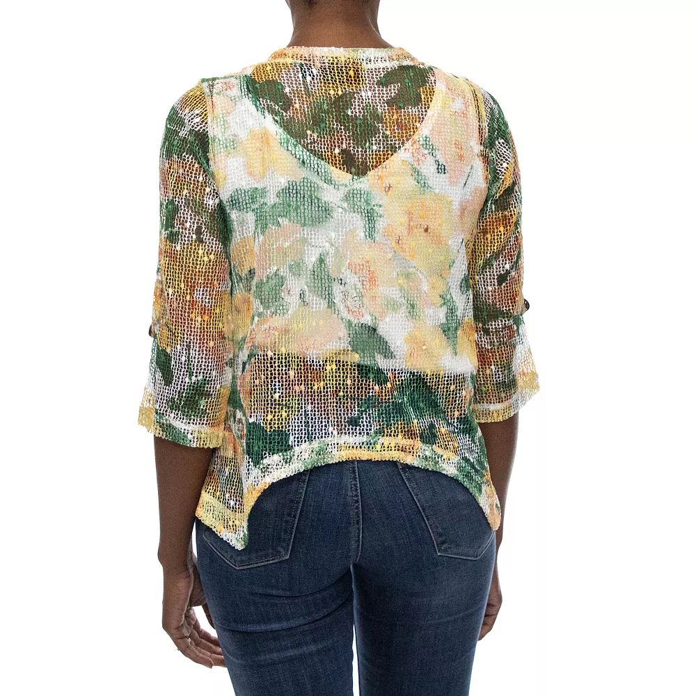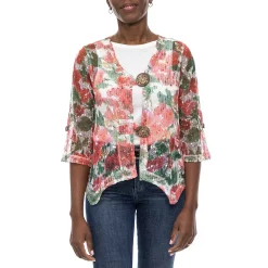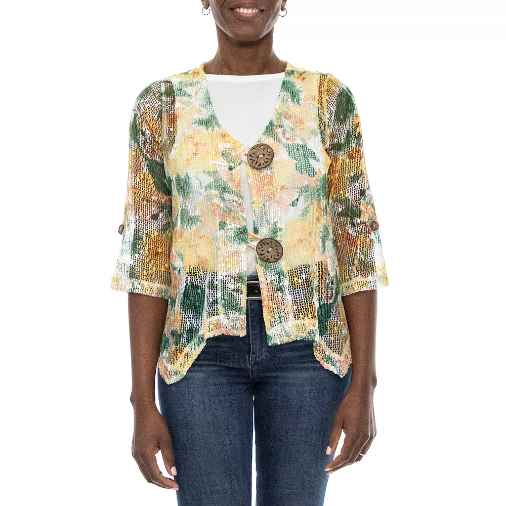 An sheer design, colorful print and oversized buttons give this women’s Nina Leonard cardigan a unique look.