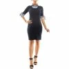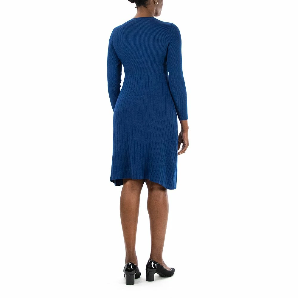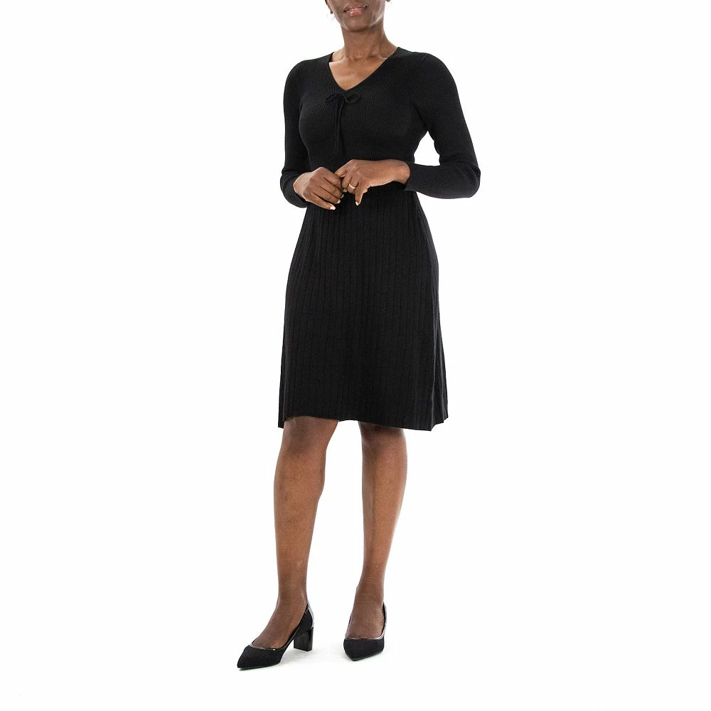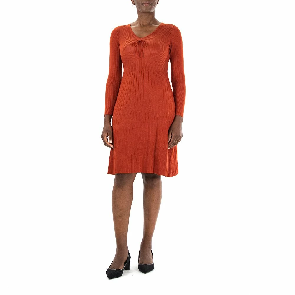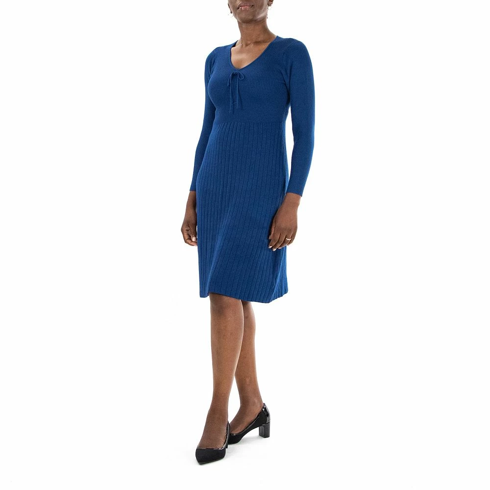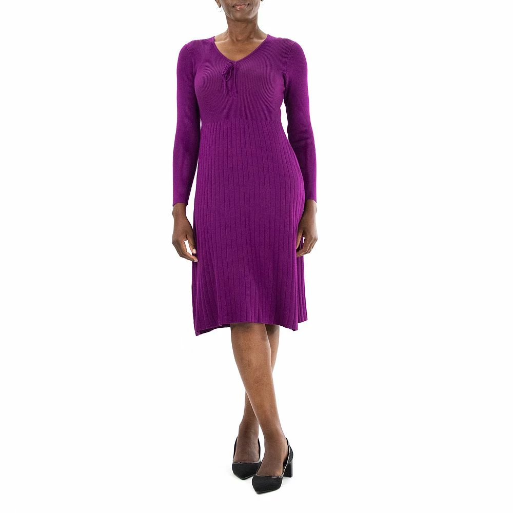 Stay stylish and cozy in this women’s A-line sweaterdress from Nina Leonard. Featuring a tie at the neckline and allover ribbed detailing, this dress really pops!