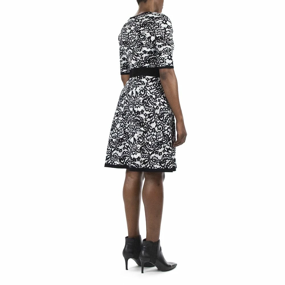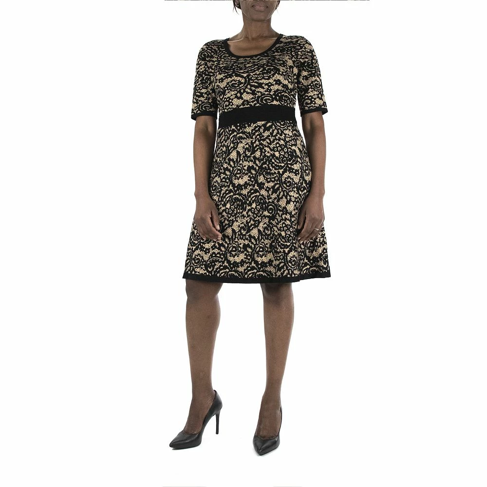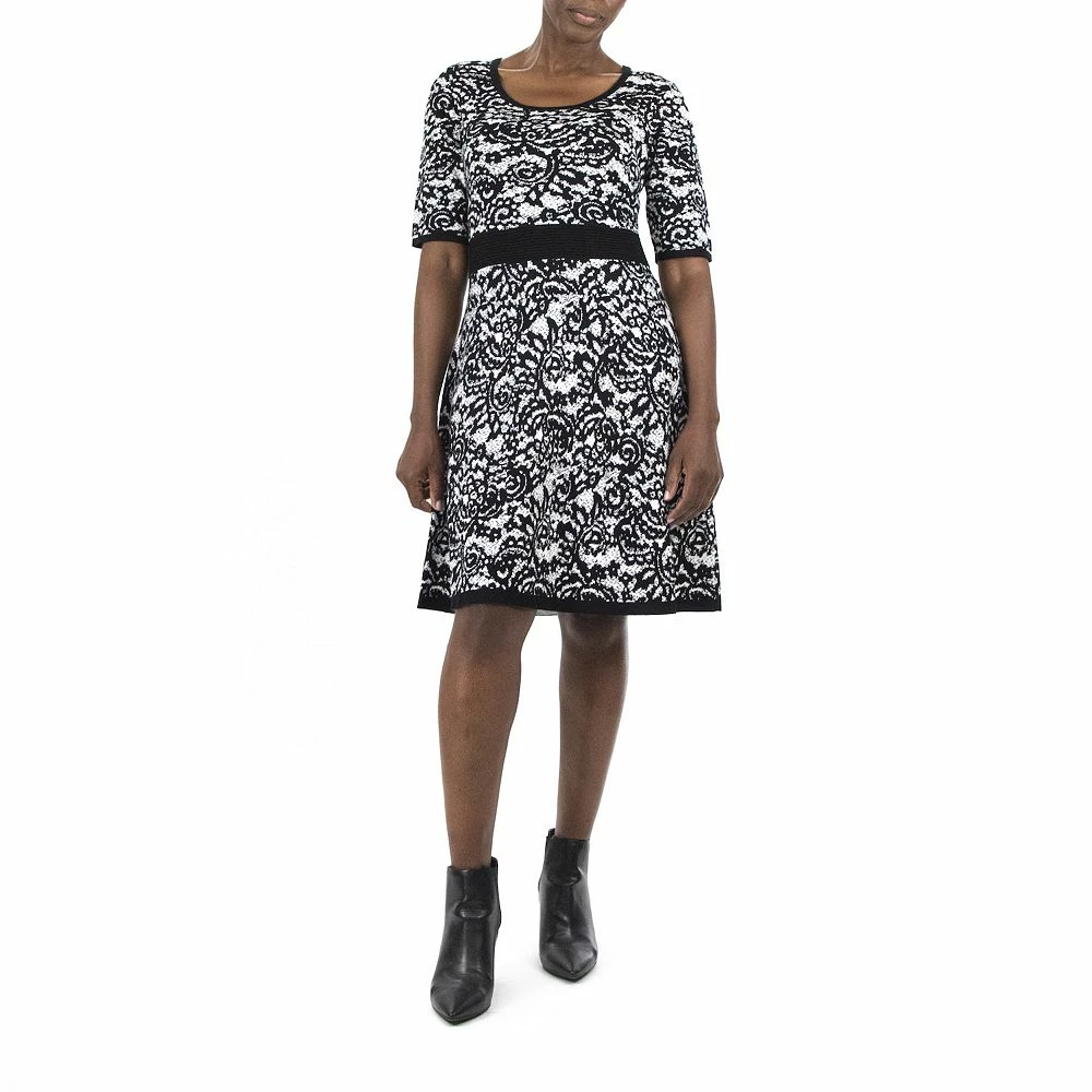 A scroll-jacquard print and cozy knit construction makes this women’s Nina Leonard sweater dress a cold-weather favorite.