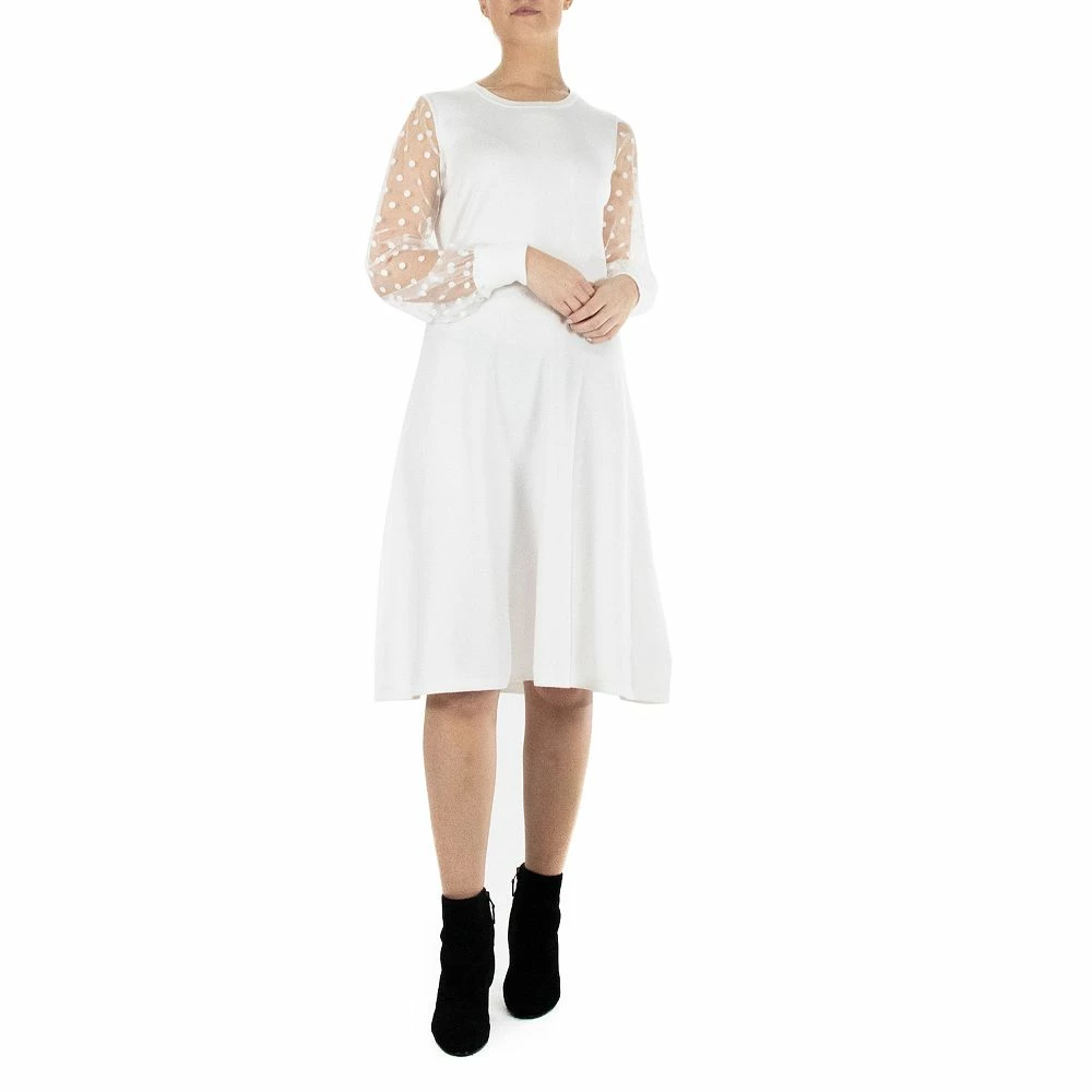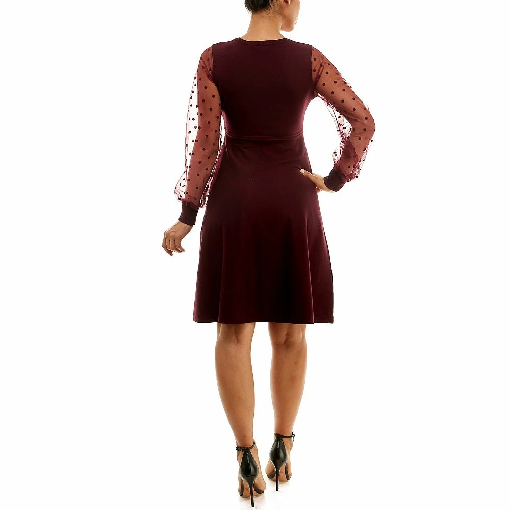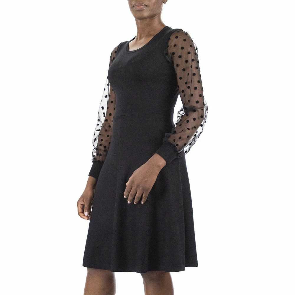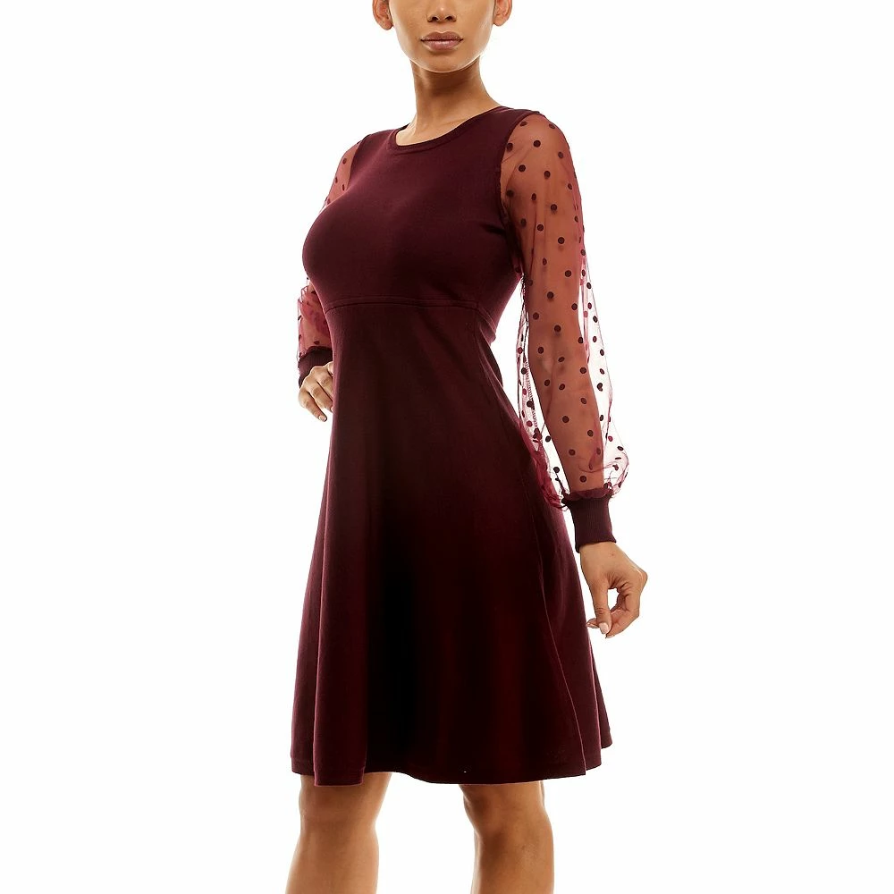 Sheer organza sleeves add a delicate look to this women’s fit & flare sweater dress.