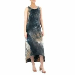 An updated tie-dye pattern and a ladderback detail makes this women’s Nina Leonard maxi dress a summertime favorite.